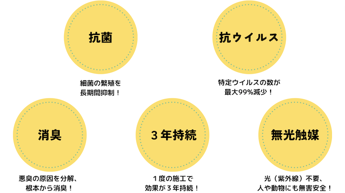 無光触媒なので全く光が無くても、抗菌・抗ウイルス・消臭・防汚・防カビが永年持続。人や動物にも安全な無機質の物質『リン酸チタニア』を使用。専用スプレーガンで噴霧施工致します。