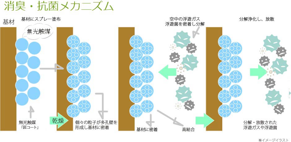 噴霧されたチタン化合物が塗布面(素材)の凸凹(ピンホール)への物理結合や素材表面の親水基(OH基)と化学結合し、固着したチタン化合物の上に溶媒の蒸発に伴い縮合を起こします。そこに強固な多孔質の無機ポリマーの薄膜(0.05~0.5μmの非結合体)が形成されます。この被膜に接触すると、細菌やウイルスは増殖力を失い、抗菌状態が維持される仕組みになっています。