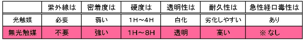 一般で有名な触媒では「光触媒」がありますが、光触媒は光がないとその効果を十分に発揮できません。「無光触媒」は光が無いどのような場所でも効果を発揮致します。また、一部の光触媒の分解力は基材をも分解し、痛めてしまう問題も発生しています。